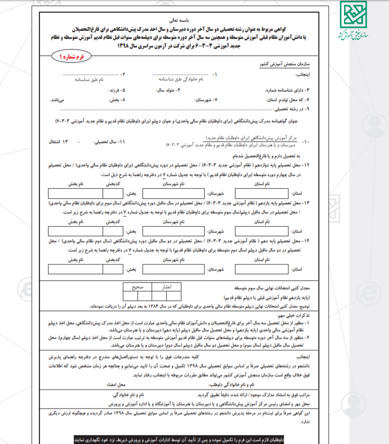 همه متقاضیا شرکت در کنکور 1400 به جز فارغ التحصیلا بخش های مرکزی شهرهای اصفهان ، تبریز، تهران، شیراز، مشهد و بخش کن شهر تهران ، بخش تجریش شهر شمیرانات ، بخش لواسانات شهر شمیرانات باید فرم شماره یک را پر کنن و به تأیید آموزش و پرورش محل تحصیل یا محل فارغ التحصیلی و یا نزدیکترین اداره آموزش و پرورش محل سکونت خود برسونن . |