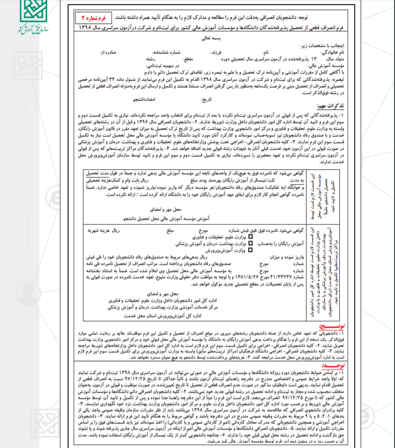 ✔️ همون طور که در این مقاله به طور کامل گفتیم درصورتی که تا 25 اسفند ماه انصراف بده میتونه در کنکور سراسری ثبت نام کنه .